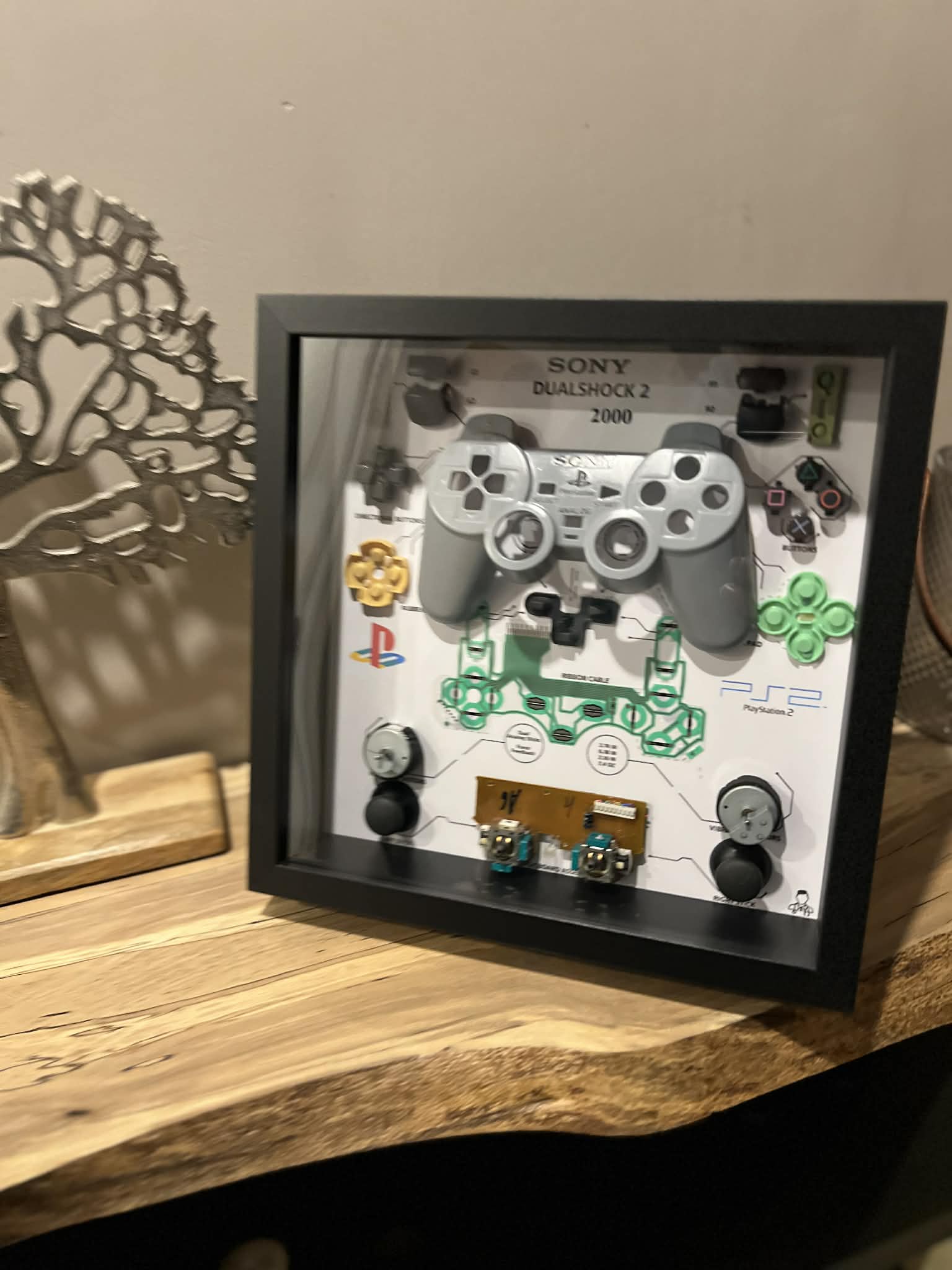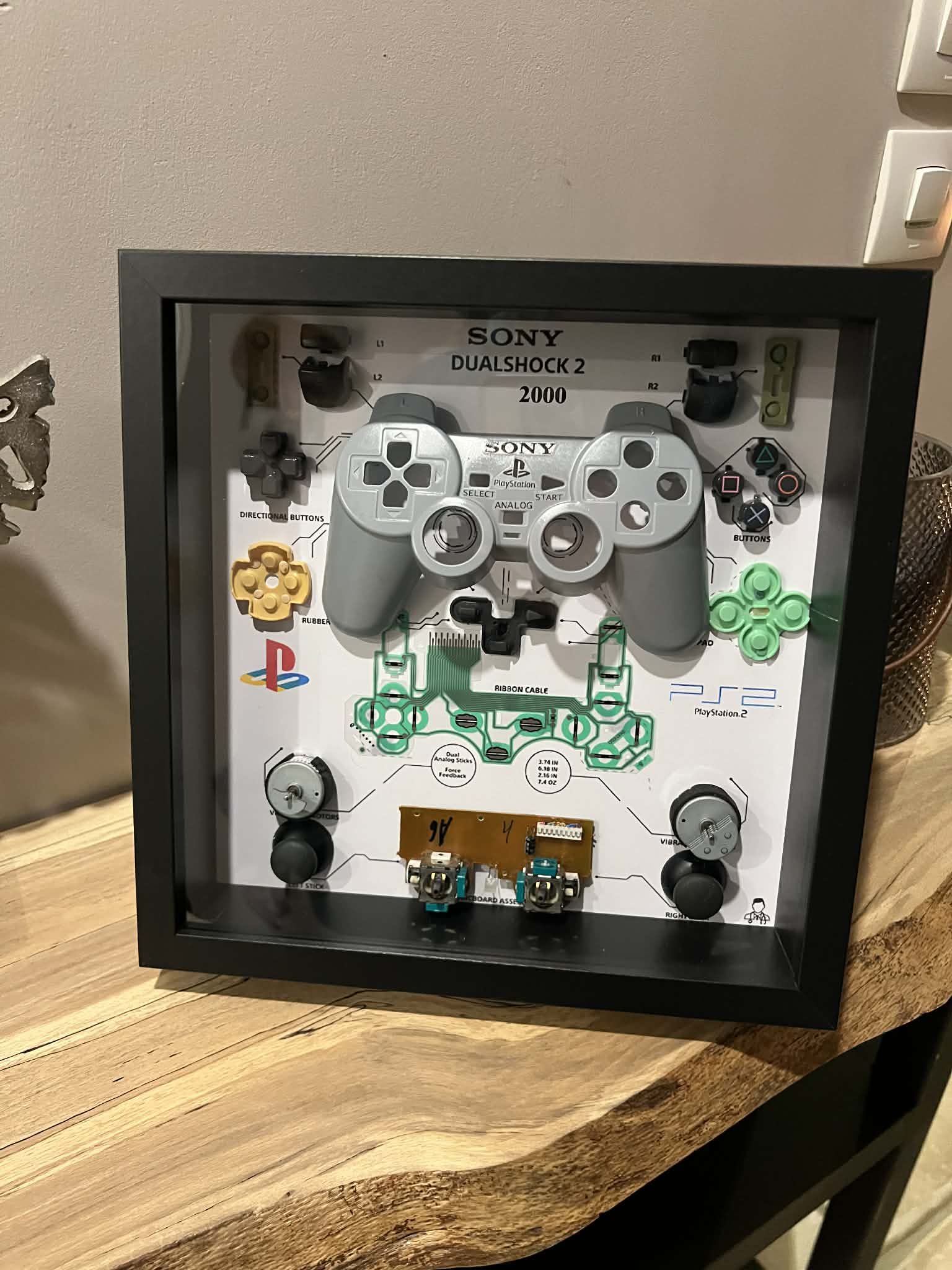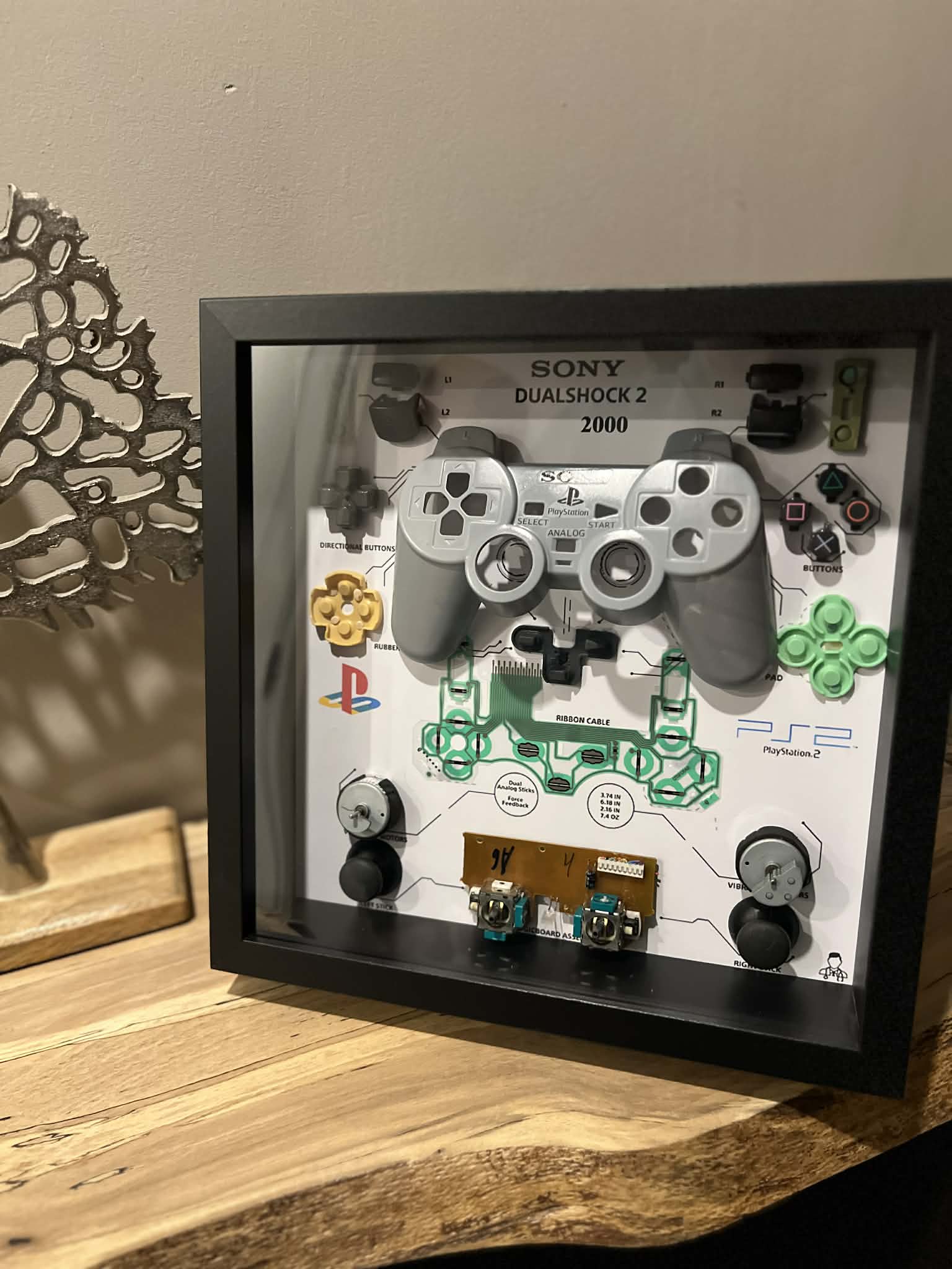 - Cette décoration unique met en valeur une manette PlayStation grise, soigneusement démontée et encadrée avec précision.
