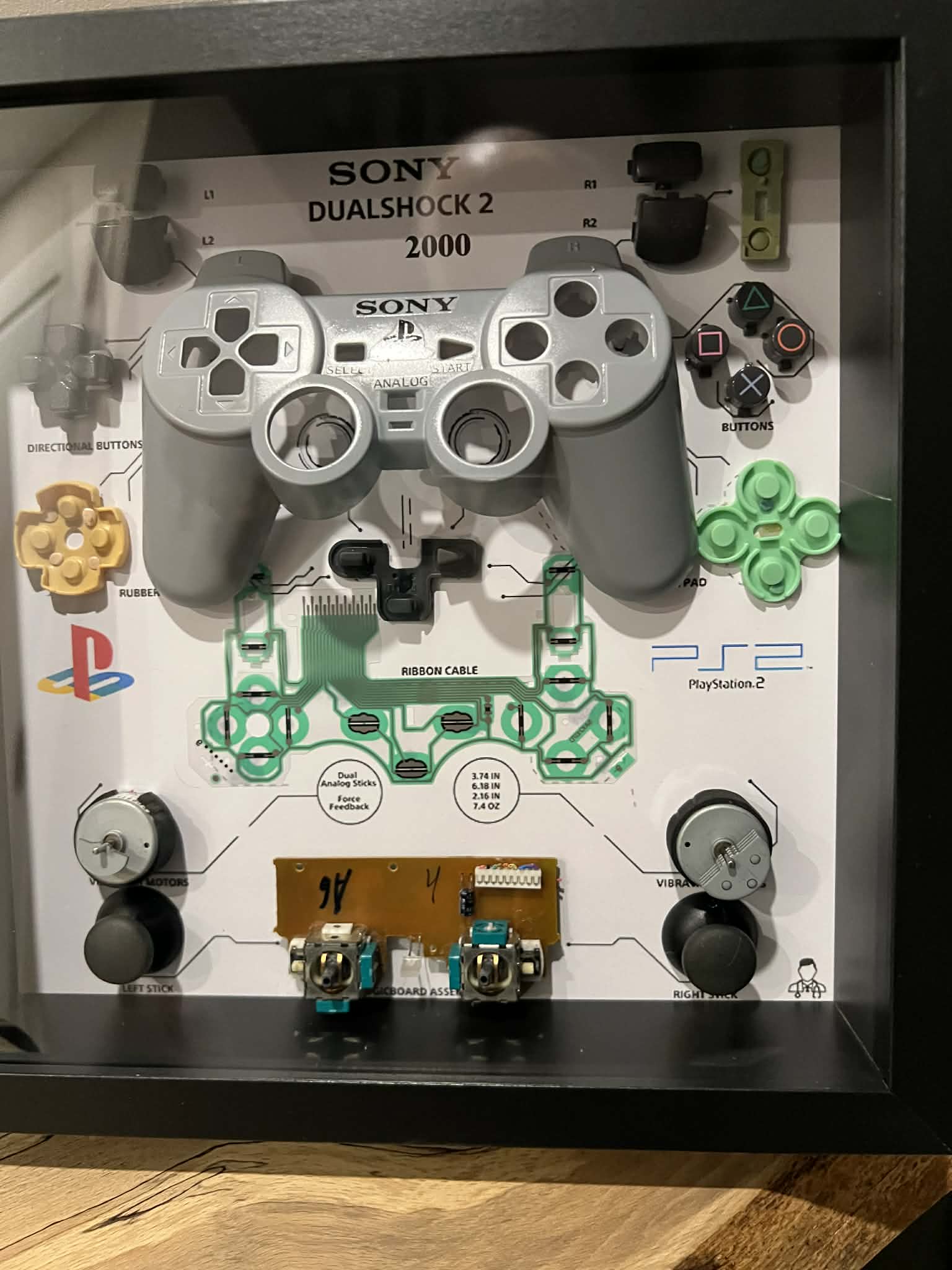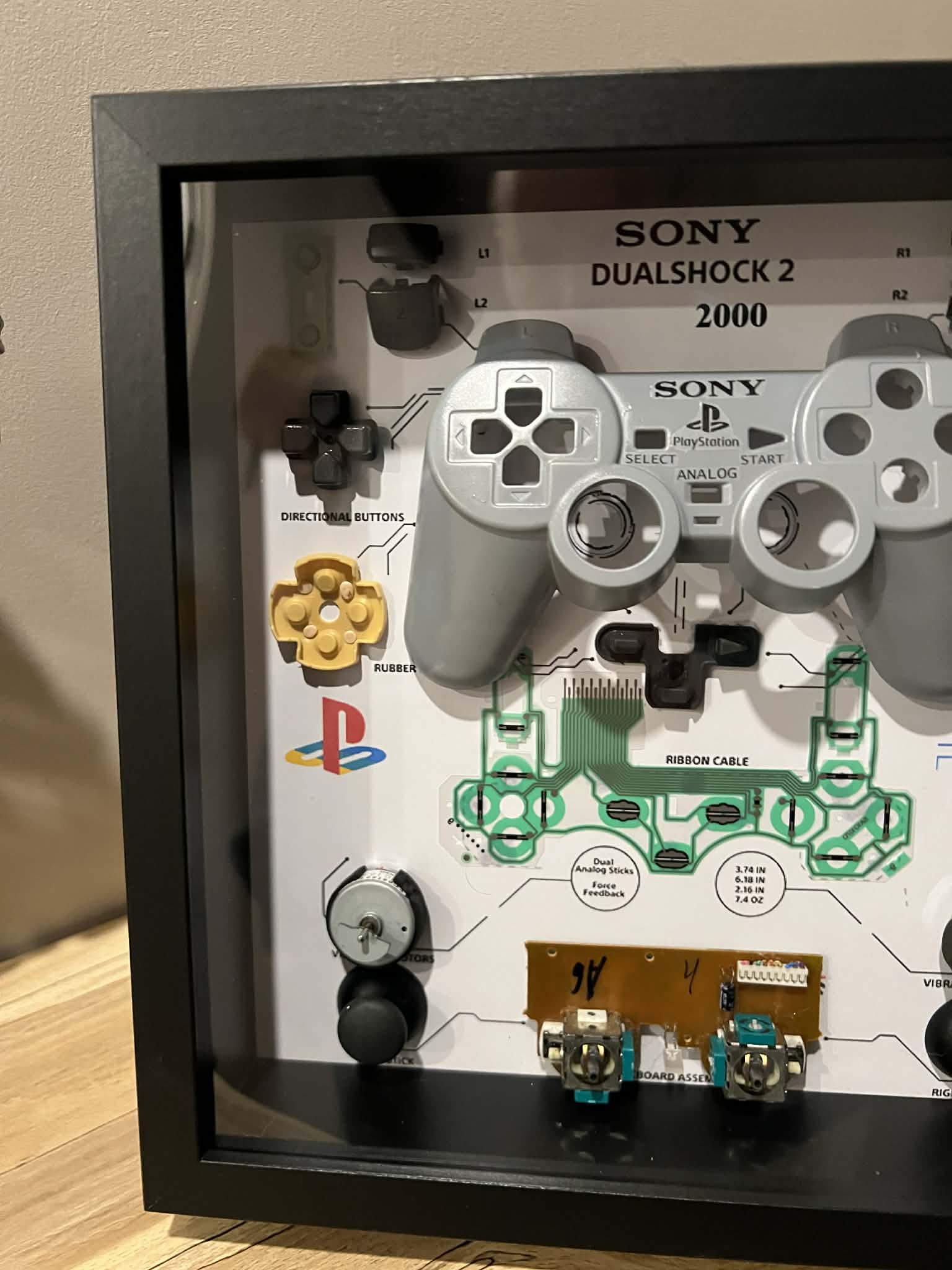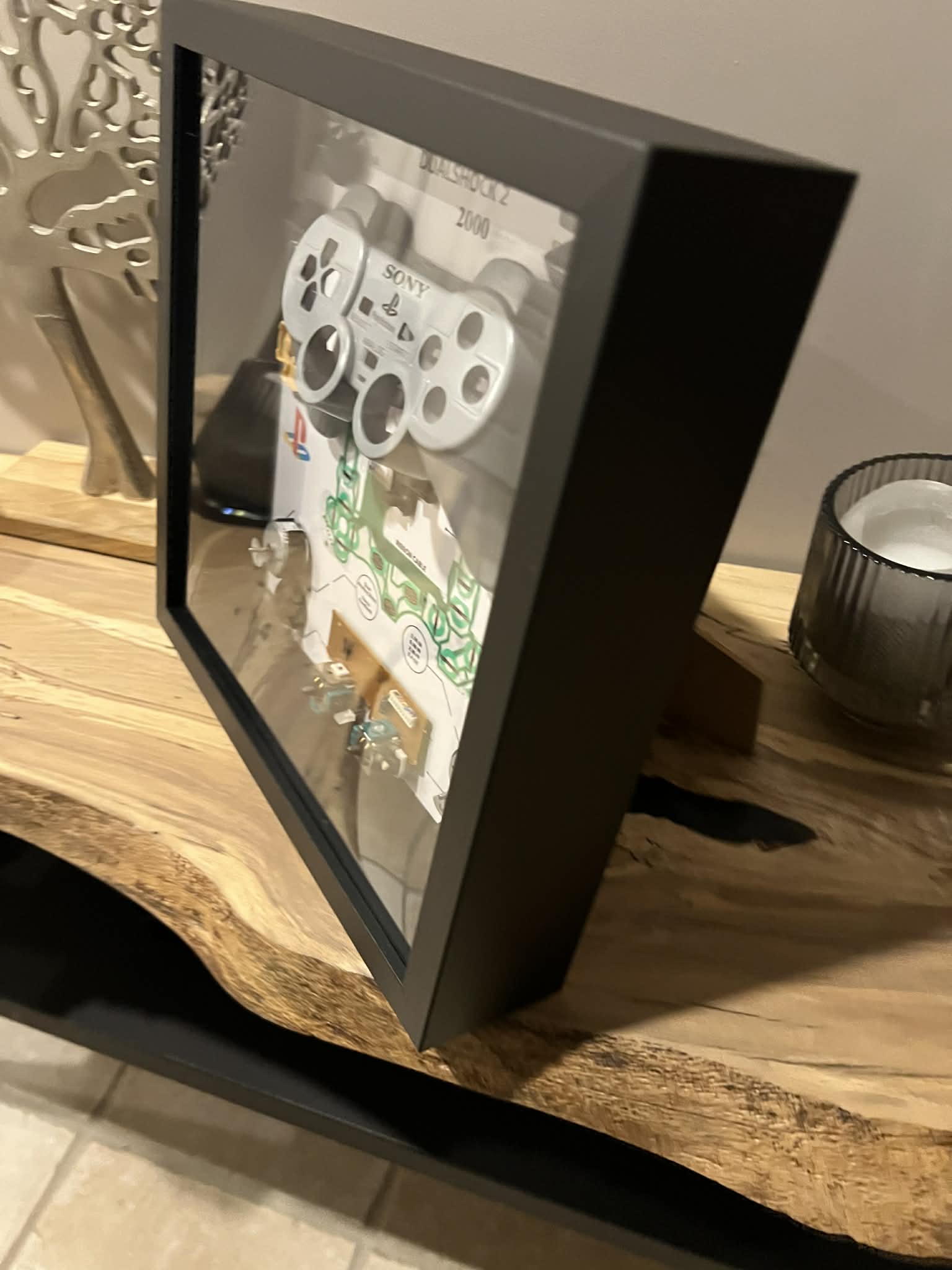 - Cette décoration unique met en valeur une manette PlayStation grise, soigneusement démontée et encadrée avec précision.
